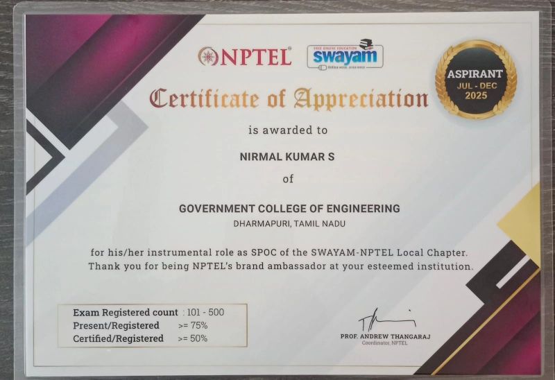 Congratulations !! Government College of Engineering, Dharmapuri and NM SPOC Mr. Alok Kumar, Assistant Professor/CSE received certificate of appreciation
