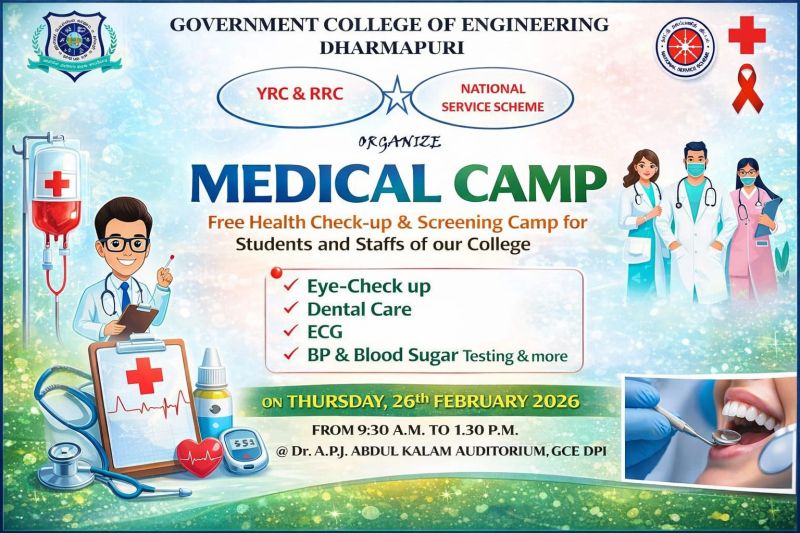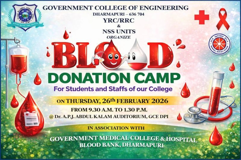 We are proud to share that the one-day Blood Donation and Medical Camp, organized by the NSS and YRC/RRC units of the Government College of Engineering, Dharmapuri, was successfully conducted on 26th February 2026 in association with Government Hospital, Dharmapuri.
