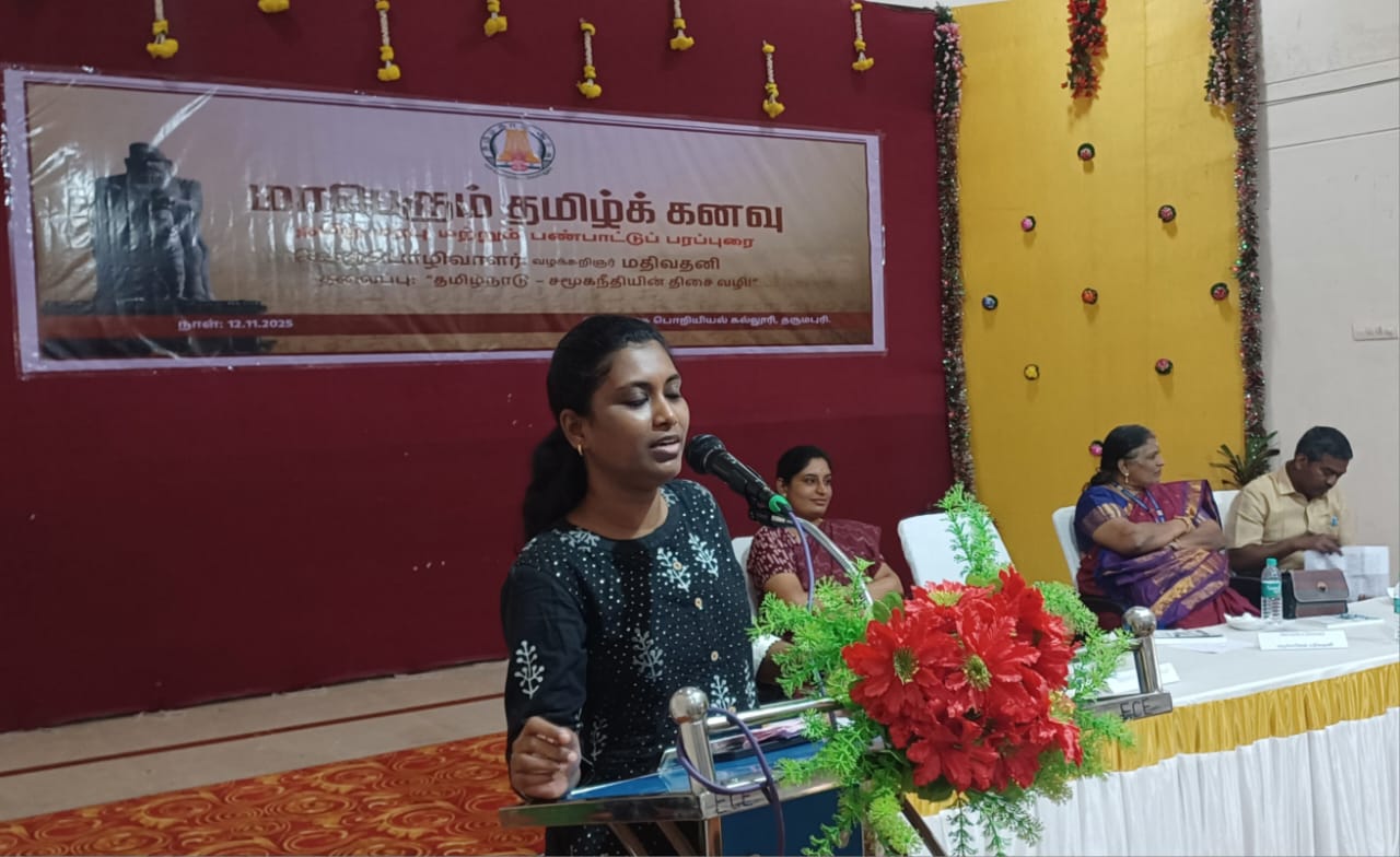 The event featured an inspiring **keynote address** by **வழக்கறிஞர் மதிவதனி** on the theme *“தமிழ்நாடு – சமூகநீதியின் திசை வழி”*, and was graced by the presence of **திரு. ரெ. சதீஸ், I.A.S., District Collector, Dharmapuri**.